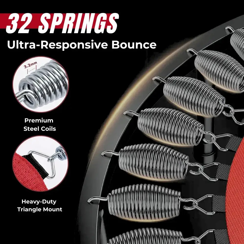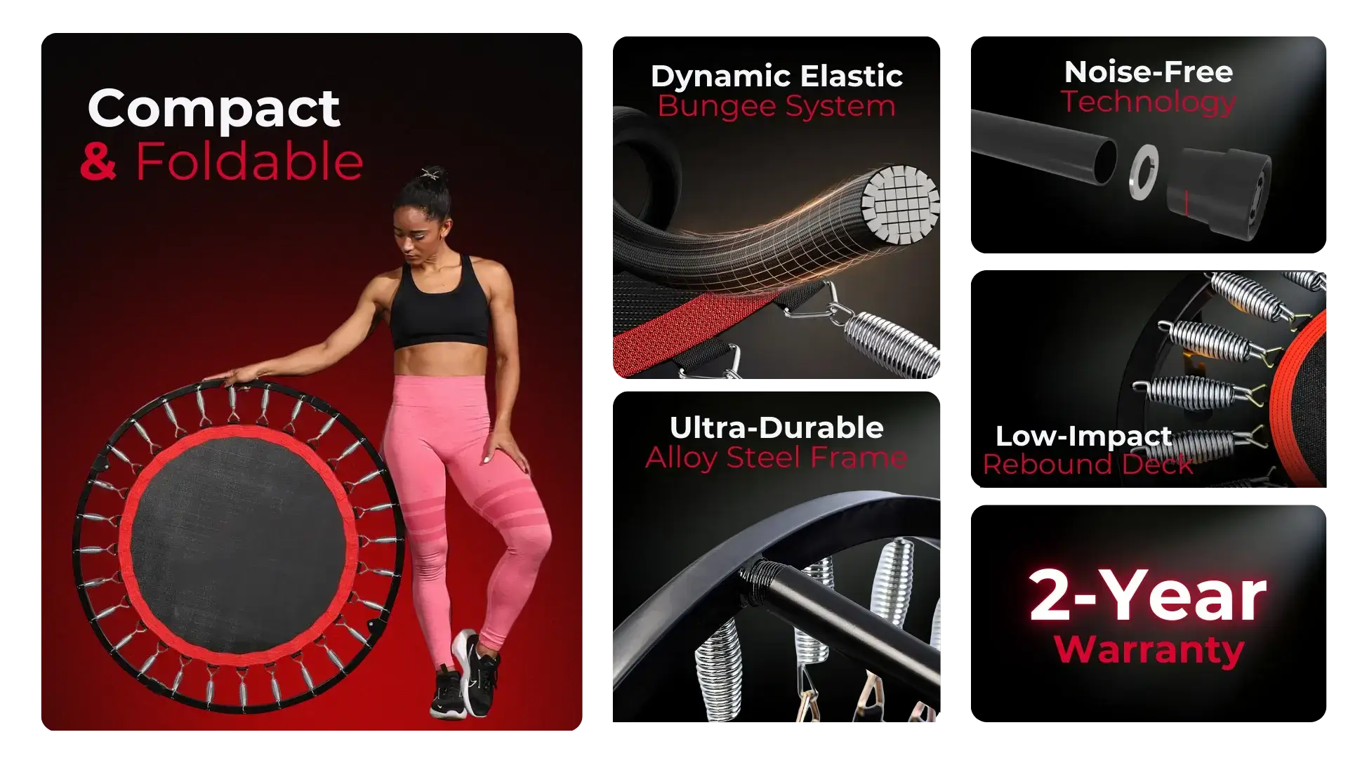 Traditional trampolines use metal springs, which are noisy, stiff, and create harsh impact on joints. The FitPax Mini Trampoline features an advanced bungee system that provides a smoother, low-impact bounce, reducing strain on your knees, back, and ankles. Plus, bungees last longer than springs, so you won’t have to worry about them wearing out.
