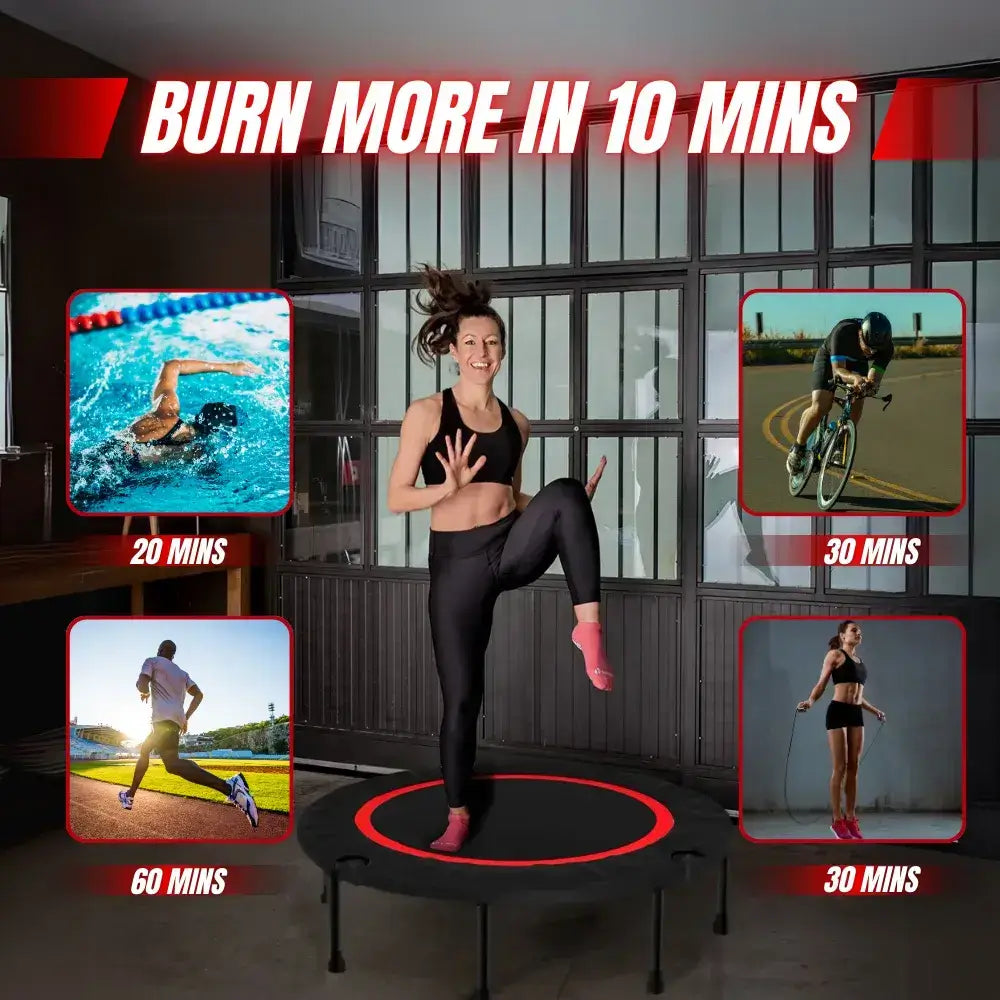 Studies show that just 10 minutes of rebounding burns as many calories as 30 minutes of jogging—but with less strain on your joints. Rebounding also improves balance, coordination, and lymphatic drainage, making it one of the most effective full-body workouts available.